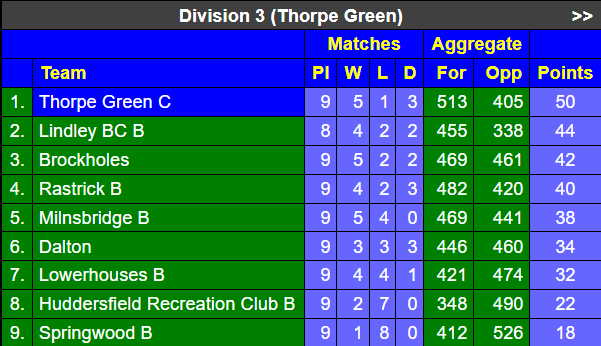 Thorpe Green appeared to be heading for a defeat after losing the first two Singles games and 13 points behind on aggregate but their Pairs came good registering a 21-4 win to share the points. That allowed the Thorpe Green 'C' team to retain top spot ahead of Lindley BC 'B' who were without a match this week and now sit 6 points behind the leaders with a match in hand.