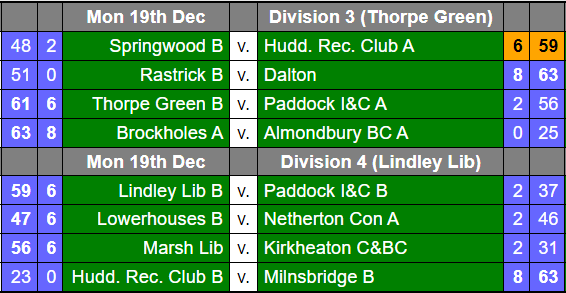 Winter League Review of the Division 3 & 4 matches played on Monday 19 December