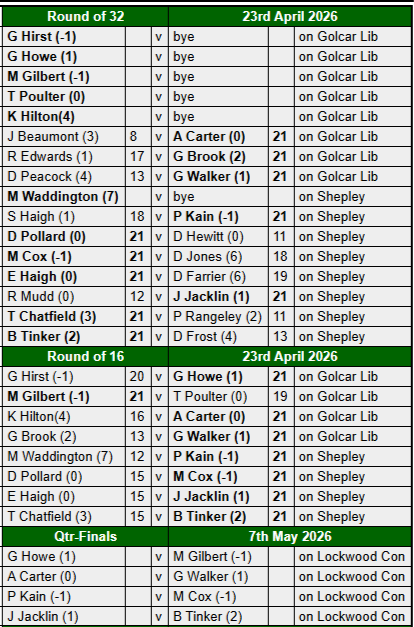 The 2024 winner of this competition, Mick Cox of Lockwood Con qualified and will meet his clubmate Peter Kain in the quarter-finals. With Finals Day being played on the Lockwood Con pairs home green, the winner of that inter-club clash will emerge as the favourite for the 2026 title.