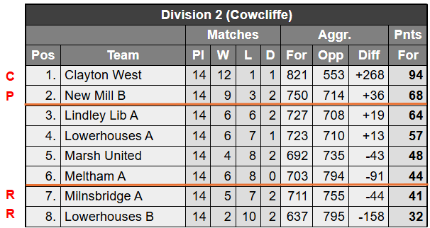 Milnsbridge A were in a comfortable mid-table position until mid-January then losing 4 of their last 5 matches to end up in the second relegation place